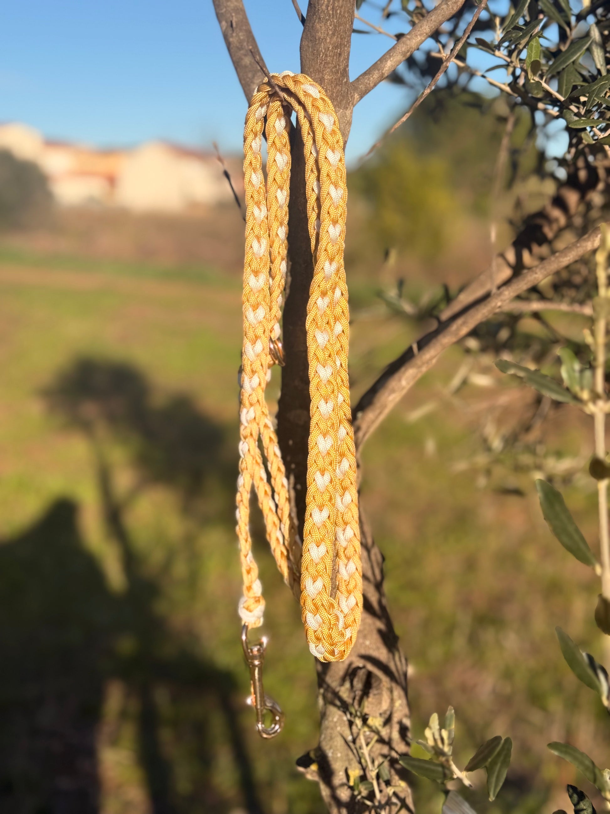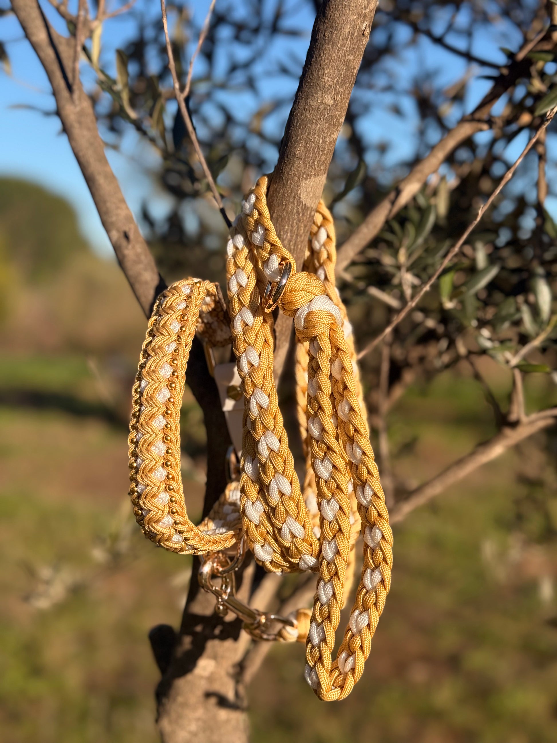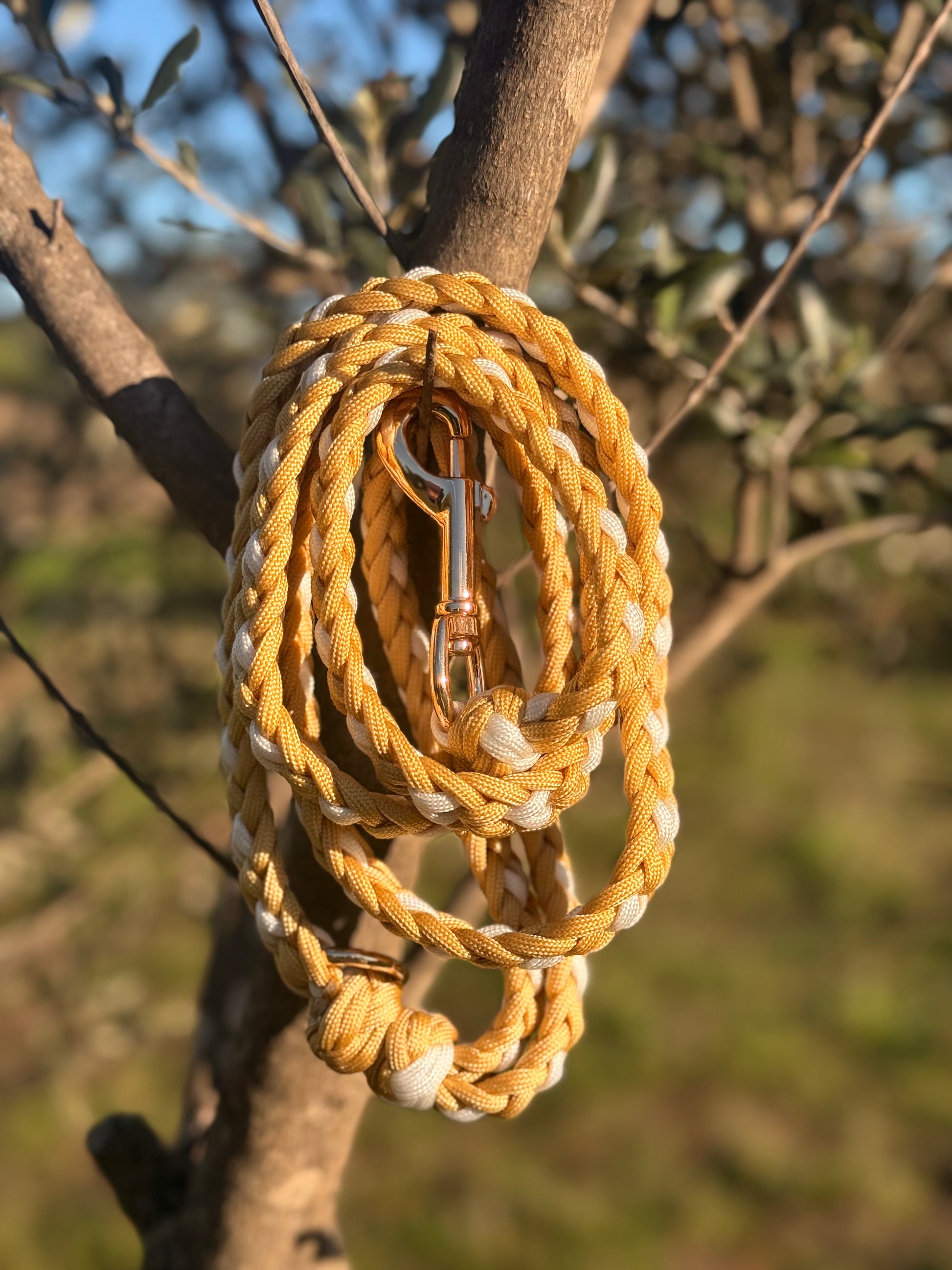 La laisse Autumn est une véritable pièce artiLa laisse Glow est une véritable pièce artisanale, conçue pour allier finesse, élégance et légèreté. Tressée à la main en paracorde fine et délicate, elle est pensée spécialement pour les tout petits chiens. Son design entièrement doré, sublimé par ses détails lumineux, en fait bien plus qu’un simple accessoire : c’est une création raffinée qui illumine vos balades au quotidien, tout en offrant une prise en main douce et sécurisée. ✨